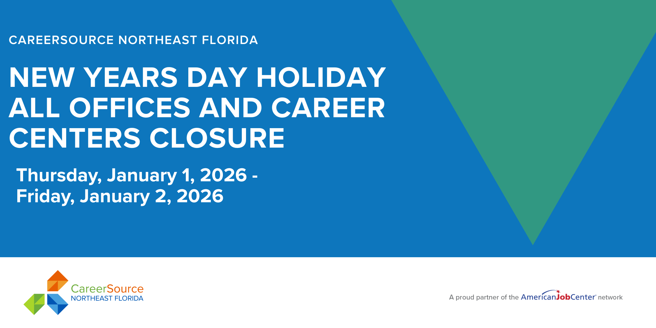 CareerSource NEFL Holiday All career centers and offices will be closed in observance of New Yearâs Holidays. Offices will re-open on Monday, January 5th, 2026 at 8:30am. |