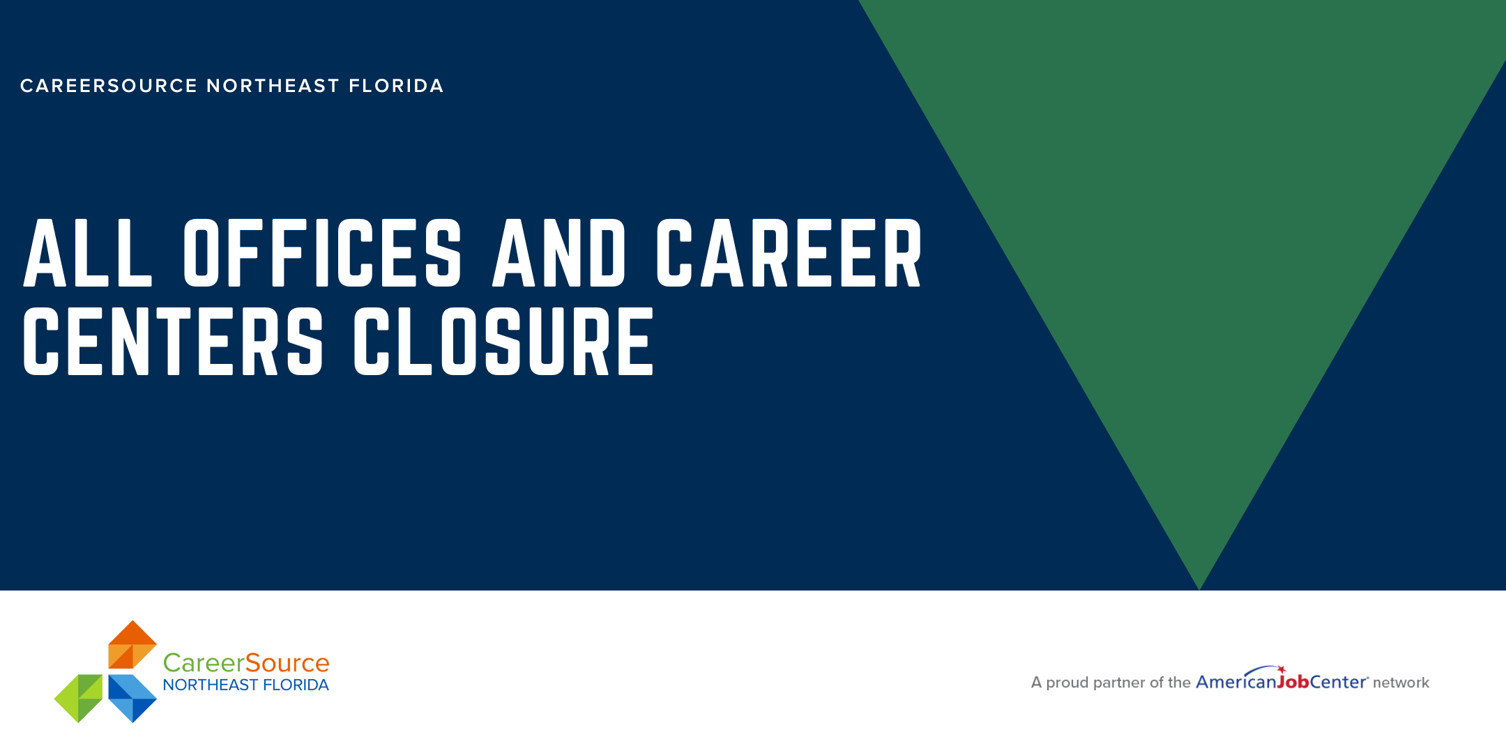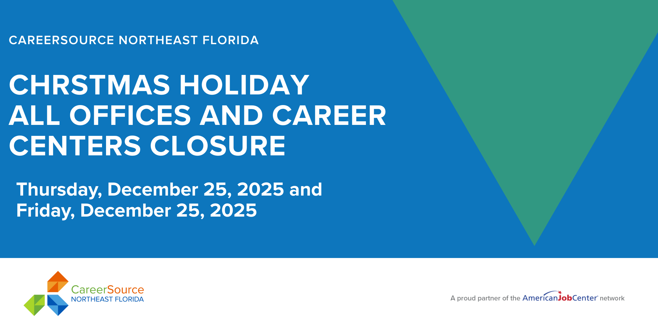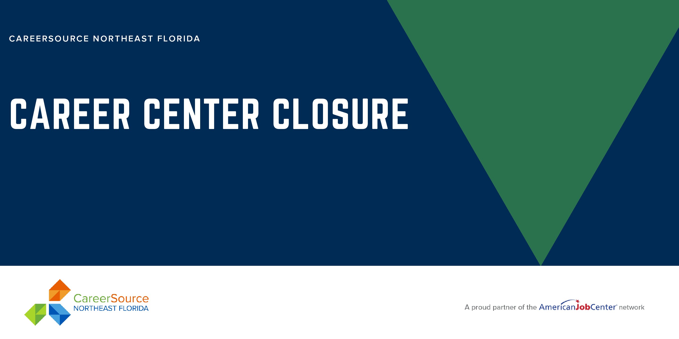 All CareerSource NEFL offices and centers will be closed on Friday, December 12, 2025Â for training. All offices and centers will reopen on Monday, December 15, 2025 at 8:30 am. Thank you. |