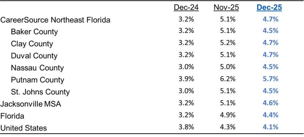 FloridaCommerce has announced that the unemployment rate for the Jacksonville region was 4.7 percent in December 2025 – down from 5.1 percent in November 2025.