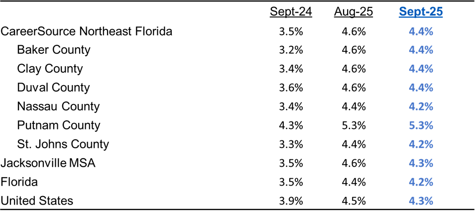 In September, Nassau County and St. Johns County recorded the lowest unemployment rates in the region (4.2 percent), followed by Baker County, Clay County and Duval County (all 4.4 percent) and Putnam County (5.3 percent).